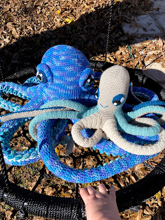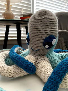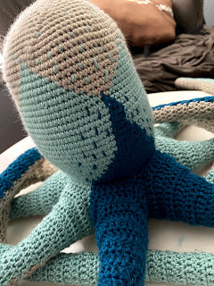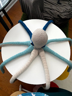 While waiting to see if I could get enough yarn to finish it, once I had run out, I started on a second one for my daughter who desperately wanted her own "oppopus." I used a smaller hook, and a thinner silk and bamboo blend from Patons in Sapphire for the body. The belly yarn was Naturally Caron Spa, a silky bamboo blend in Misty Taupe, which is kind of a very soft tan, like sand... Of course I got two tentacles done and realized I had not enough to do the rest... So her Oppopus turned into a bit of a stash buster as I went through the single skeins of Naturally Caron Country in Ocean Spray blue, and Naturally Caron Spa in White. I had plenty of the Misty Taupe for the belly so the bottom is all one color. I did not do the suckers on hers.