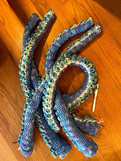 Putting the legs together is a bit tough since they are so big. I had them spread out on the table so they could spin around flat while I would crochet along the tops. Id also used stitch markers to hold them to each other. After the initial few rows I tied them together long ways with some scrap yarn in one big chunk to make working into the head a bit easier. Compared to the tentacles, the rest of Apollo was a breeze.