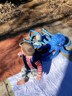 Did I mention yet that he is huge? Such a nice weight too with the cotton yarn. He makes an excellent floor pillow as his head is a lovely shape and the arms add support or comfort. I was seriously laying in the sun on him watching my son play in the leaves.